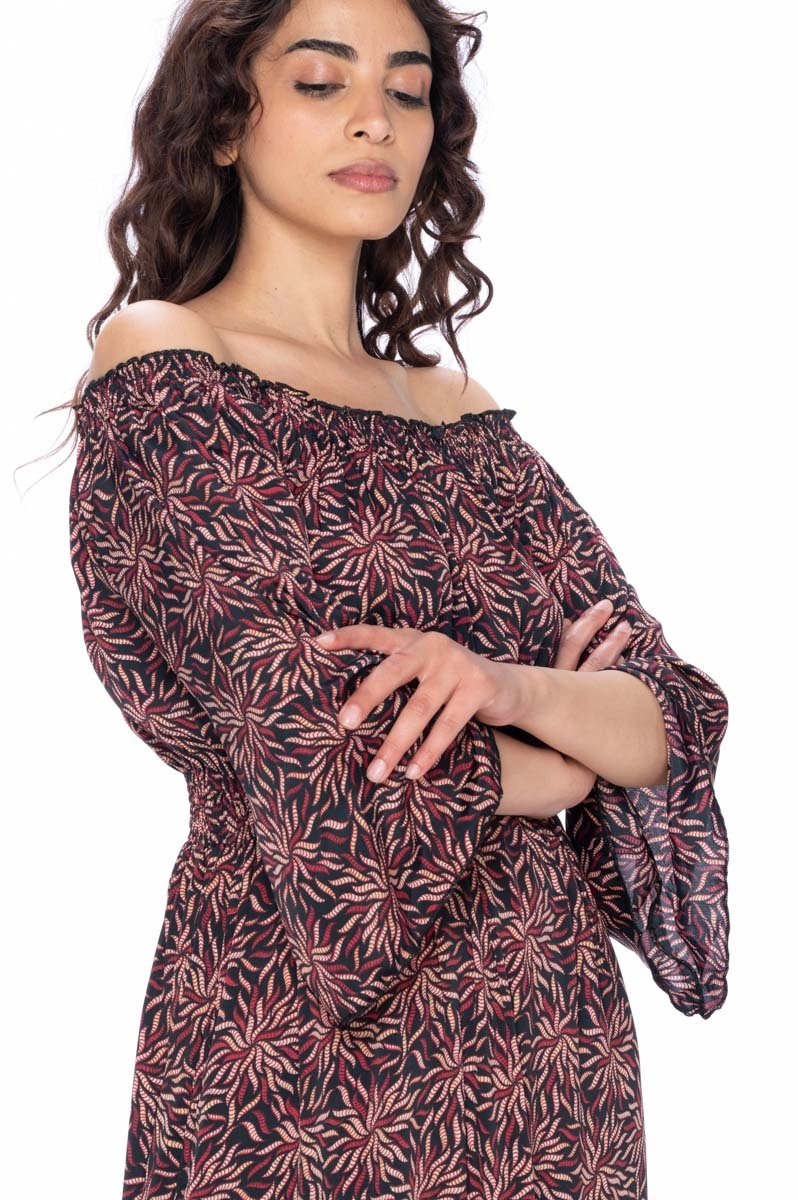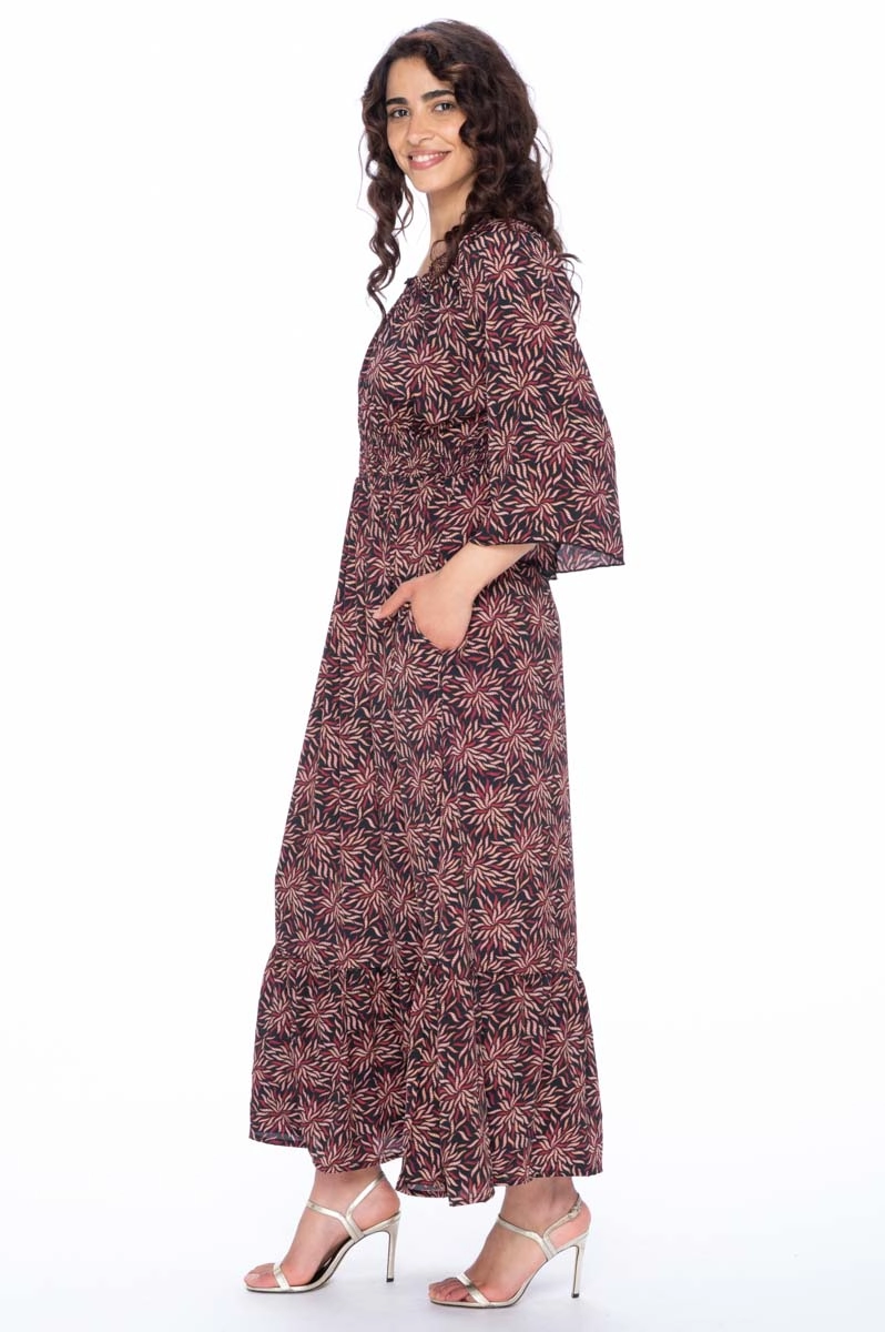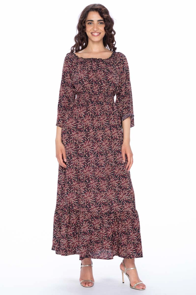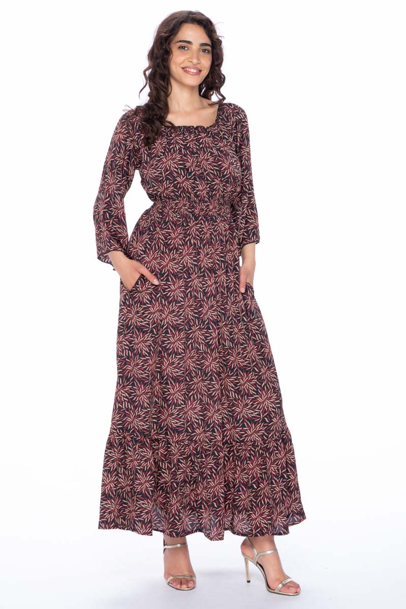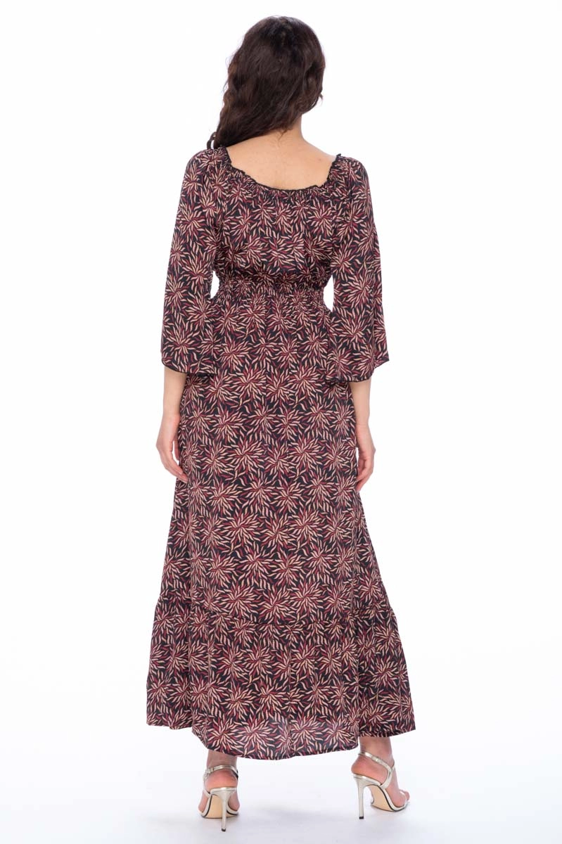Robe longue en soie indienne à la ligne fluide, idéale pour celles qui recherchent une robe d’été femme légère et originale. Le modèle présente un large décolleté avec fronces élastiques pouvant être porté légèrement tombant sur les épaules, des manches trois quarts évasées et une taille élastiquée. Le bas terminé par un volant apporte du mouvement et rend cette robe en soie parfaite pour la saison printemps été.