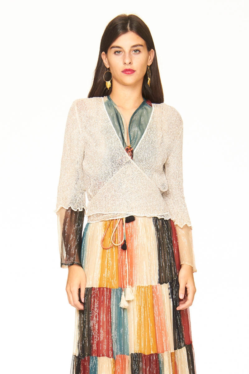 Boléro lumineux en rayonne blanc cocco, fil lurex argenté tissé dans le fil.