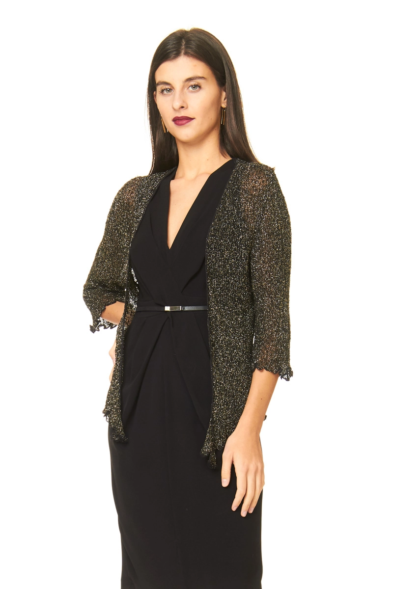 Boléro or et noir. Le boléro peut être porté comme une veste courte ouverte sur le devant, ou fermé par un simple nœud.