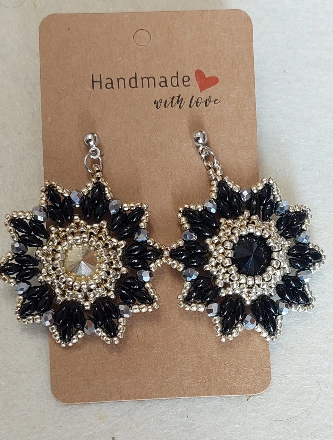 Boucles d’oreilles artisanales réalisées à la main à Florence avec technique de tissage de perles et cristaux. Le cristal central noir de 14 mm, brillant, est entouré de perles argent et de SuperDuo facettées, pour un effet lumineux et raffiné. Modèle unique, non reproductible, idéal pour les cérémonies, événements exclusifs, tenues de soirée et fêtes de fin d’année.