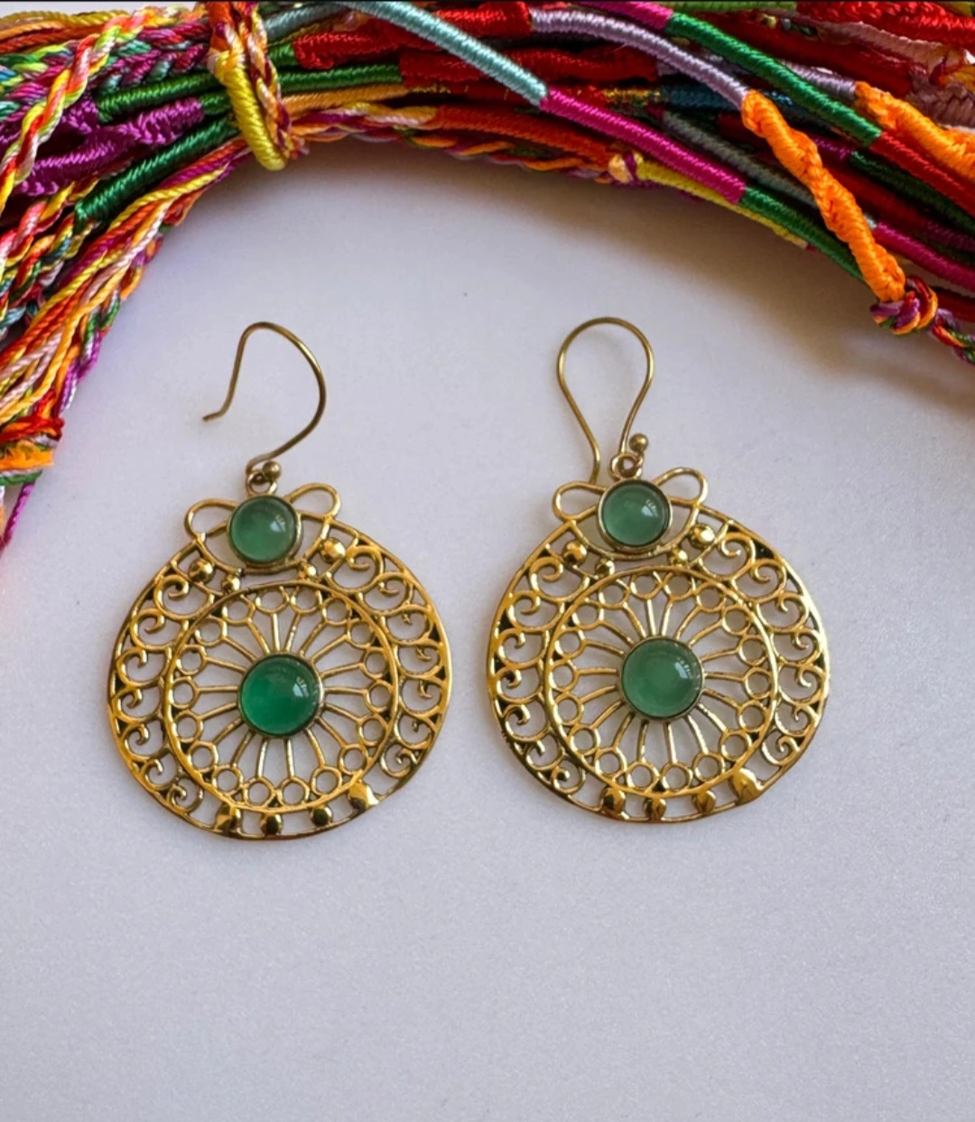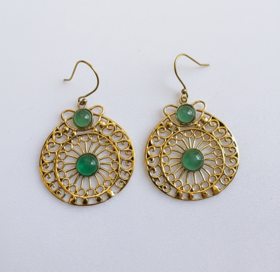 Boucles d’oreilles en laiton doré hypoallergénique avec insert façon onyx vert, inspirées de la tradition boho indienne. Le design ajouré crée un effet de lumière qui met en valeur le visage. Modèle léger, parfait pour ajouter une touche ethnique à tout type de tenue.