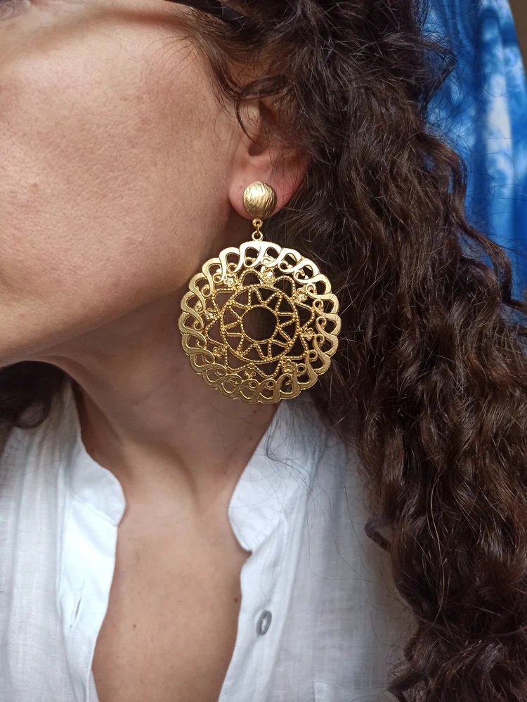 Boucles d’oreilles ethniques pendantes réalisées en zamak doré, un alliage composé de cuivre, de zinc et d’aluminium, également connu sous le nom de zamak. Travaillées artisanalement en Inde, elles présentent une forme circulaire ajourée avec décorations ethniques qui apportent légèreté et mouvement au bijou.