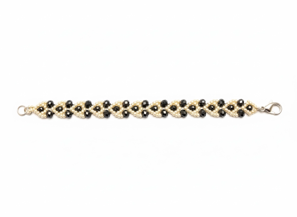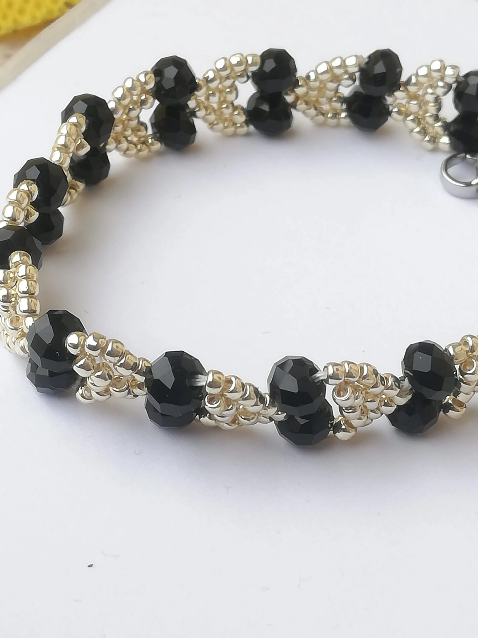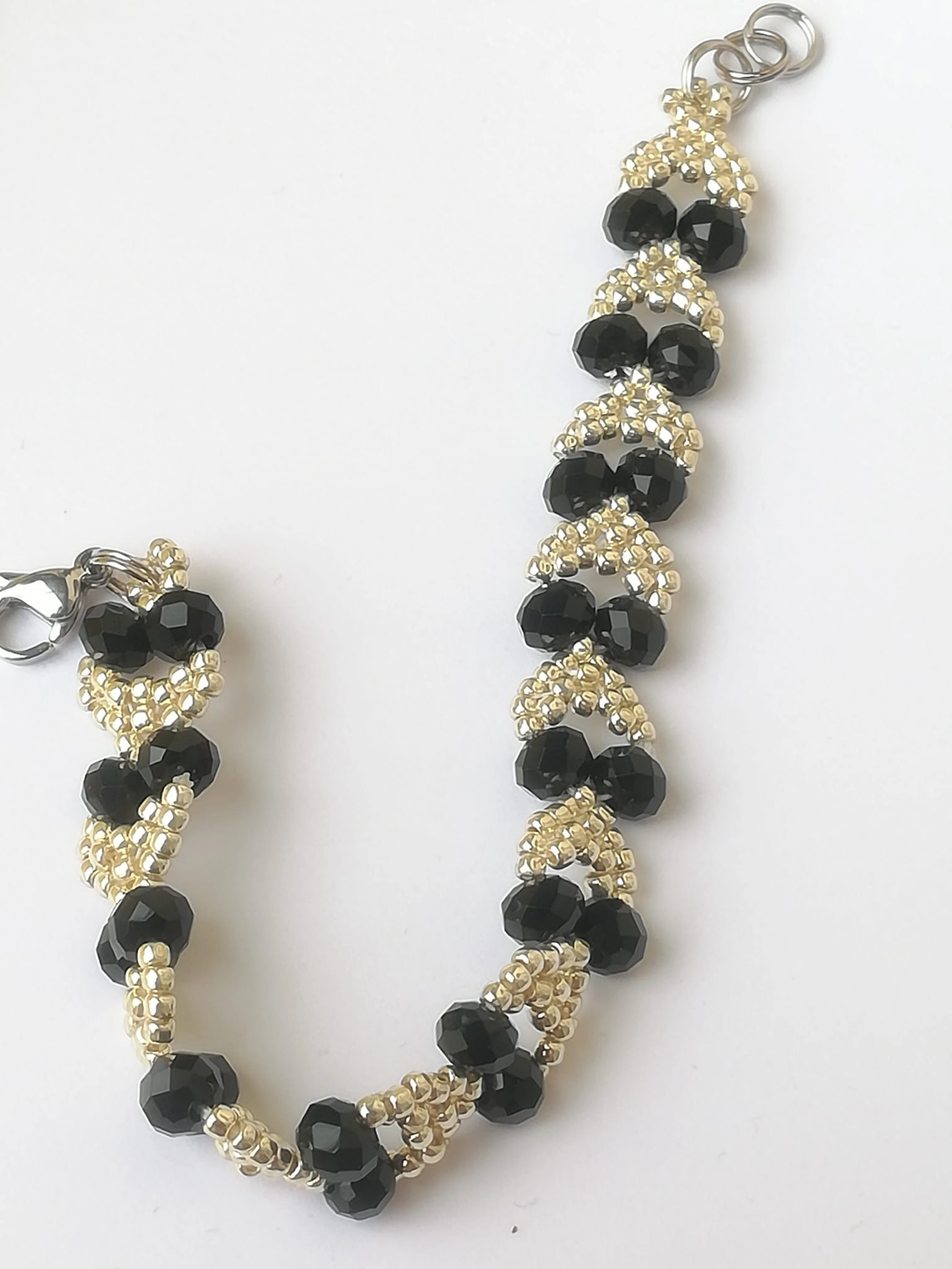 Bracelet pour femme composé de perles de couleur argentée et de cristaux noirs. Longueur totale d'environ 17 cm. Fermeture en acier avec mousqueton.