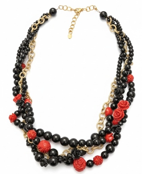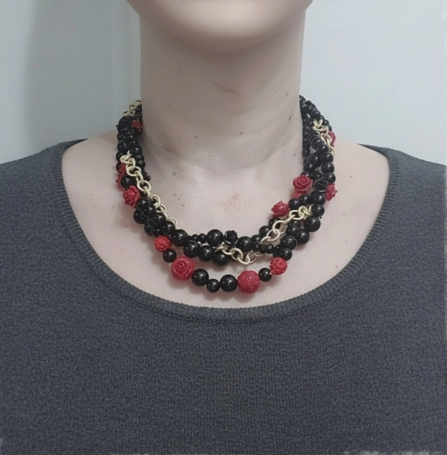 Composé de : perles en résine noires de différentes tailles (4-10 mm) et petites roses en résine rouges, pour un contraste sophistiqué.