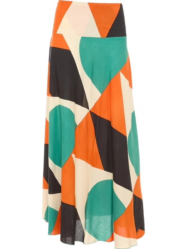 Jupe longue en 100 % viscose avec coupe évasée et bande élastiquée haute au dos effet smock qui s’adapte facilement à la silhouette. Le modèle est doté de poches latérales et présente une fantaisie abstraite dans les tons noir, crème, vert et orange.