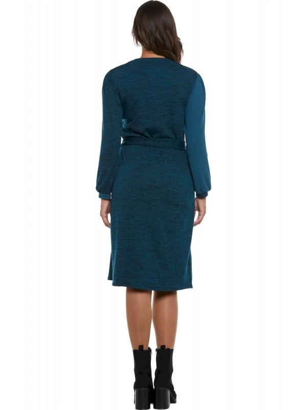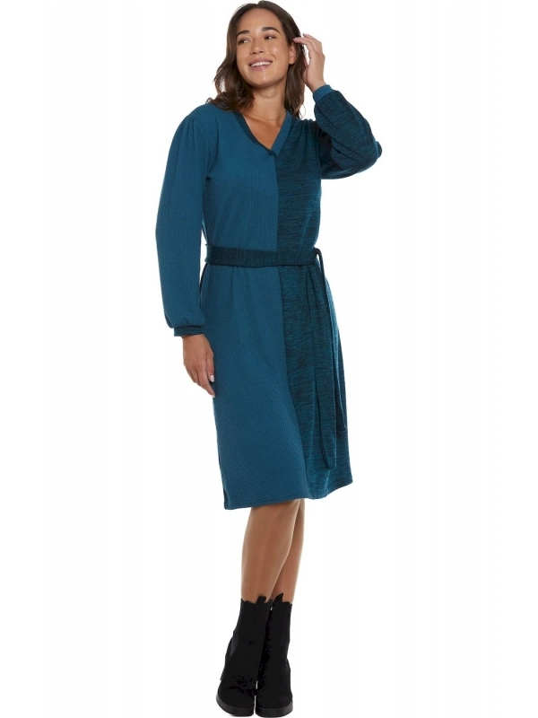 Robe midi à manches longues de la collection hivernale Happy Baba, la ligne grande taille de Baba Design. Chaque modèle est conçu avec deux tissus différents : l’un lisse, l’autre texturé en relief, associés dans une seule pièce pour créer un effet bicolore.