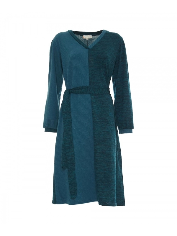 La coupe est fluide, le décolleté est en V, et la ceinture assortie est amovible. Disponible en deux combinaisons de couleurs : vert ou pétrole. Deux tailles disponibles (consultez le guide des tailles).