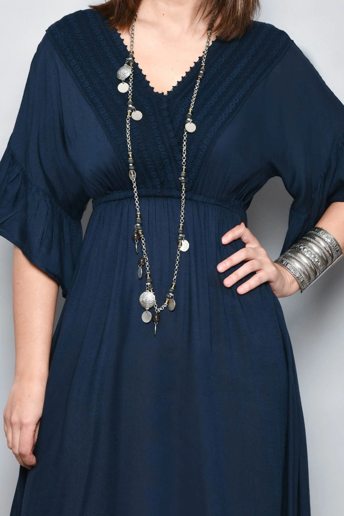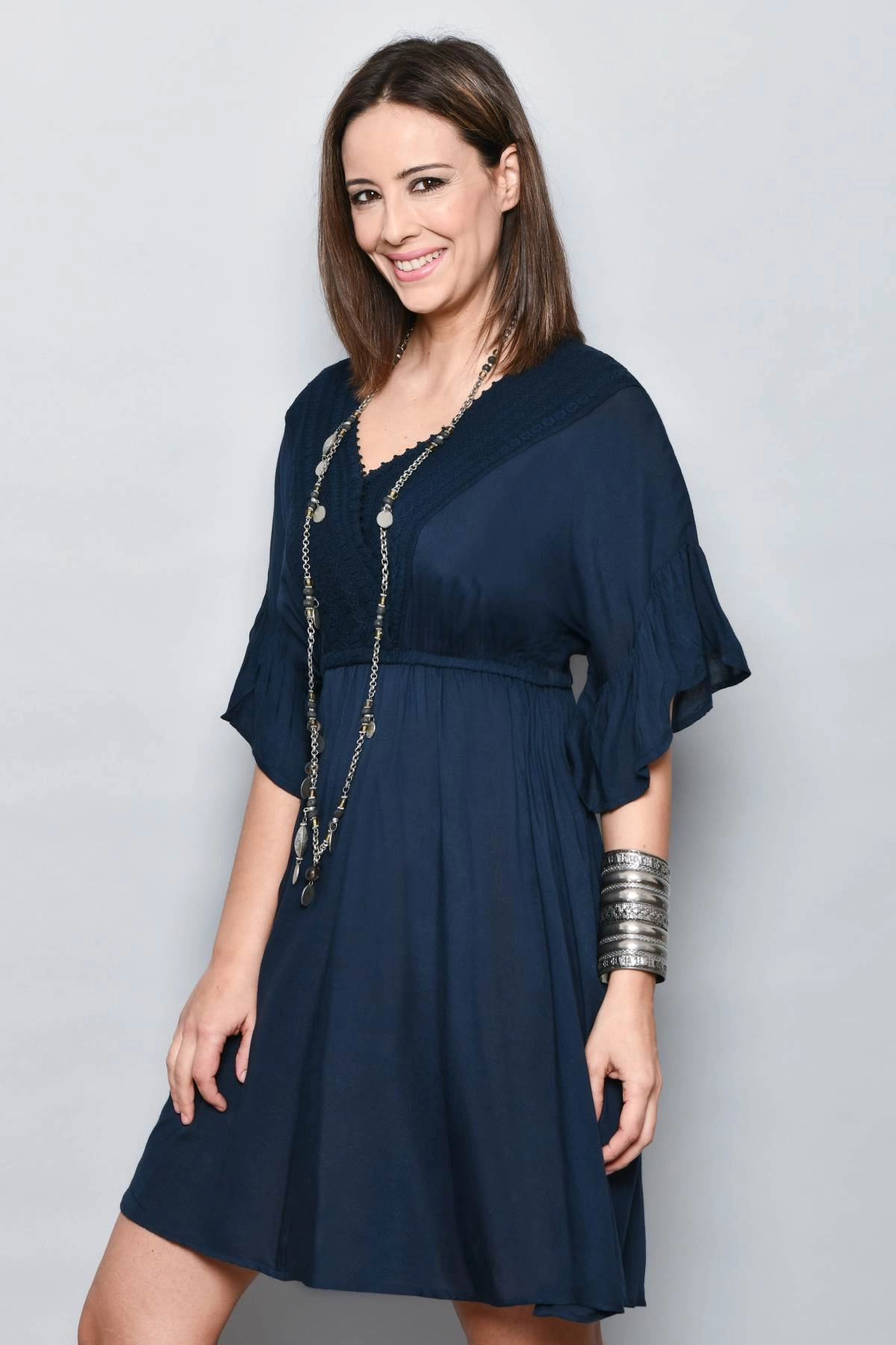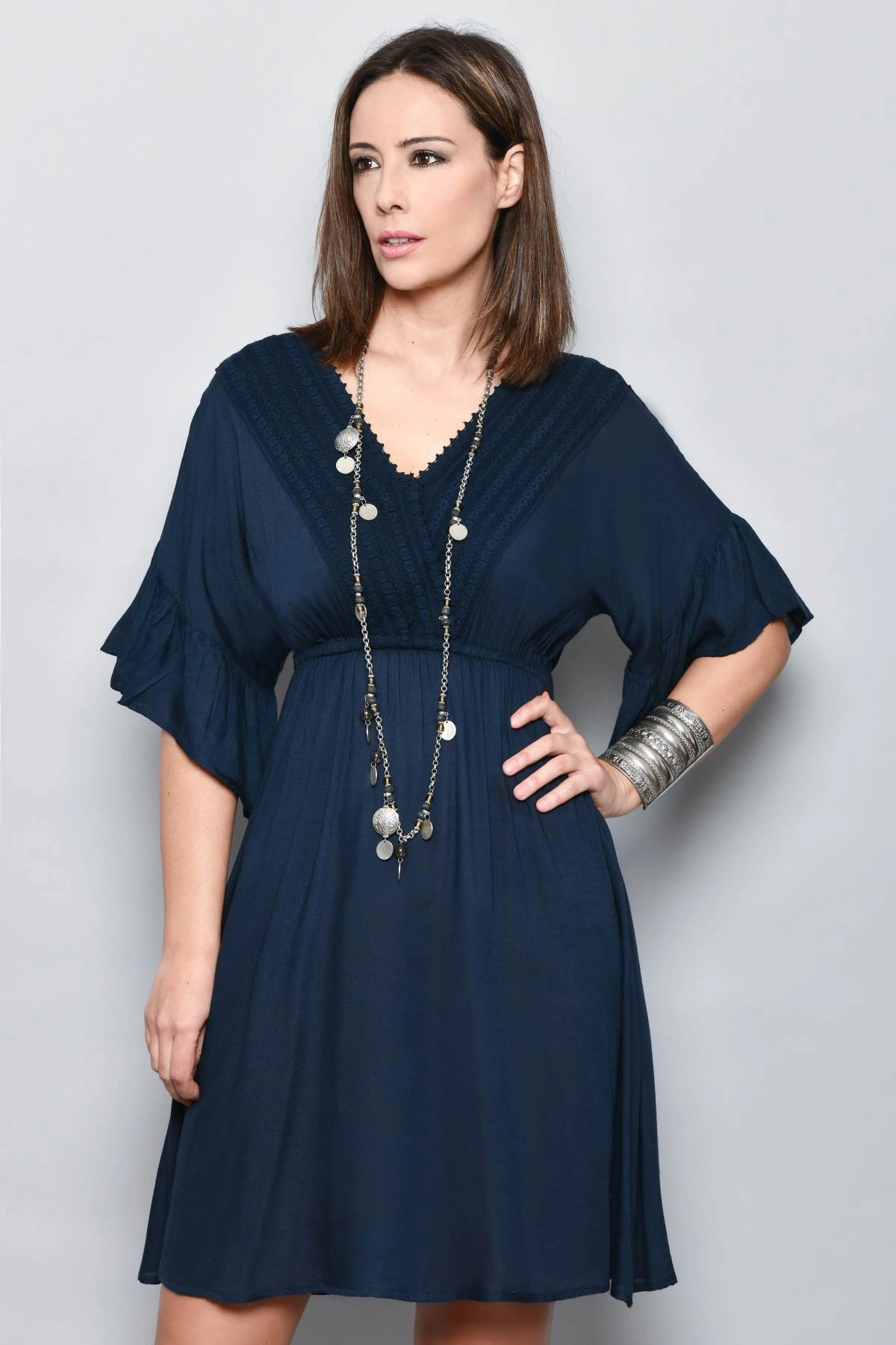 Robe courte femme d’été en viscose légère et agréable à porter, idéale pour la ville pendant la saison chaude. La couleur bleu marine rend la robe facile à assortir et adaptée à de nombreuses occasions, du jour au soir. Le modèle présente un col en V sublimé par des inserts en dentelle, un détail raffiné qui apporte du caractère sans alourdir la silhouette. La taille élastiquée accompagne les formes et crée une ligne souple qui ne serre pas et ne marque pas, tandis que les manches amples et fluides assurent confort et légèreté.