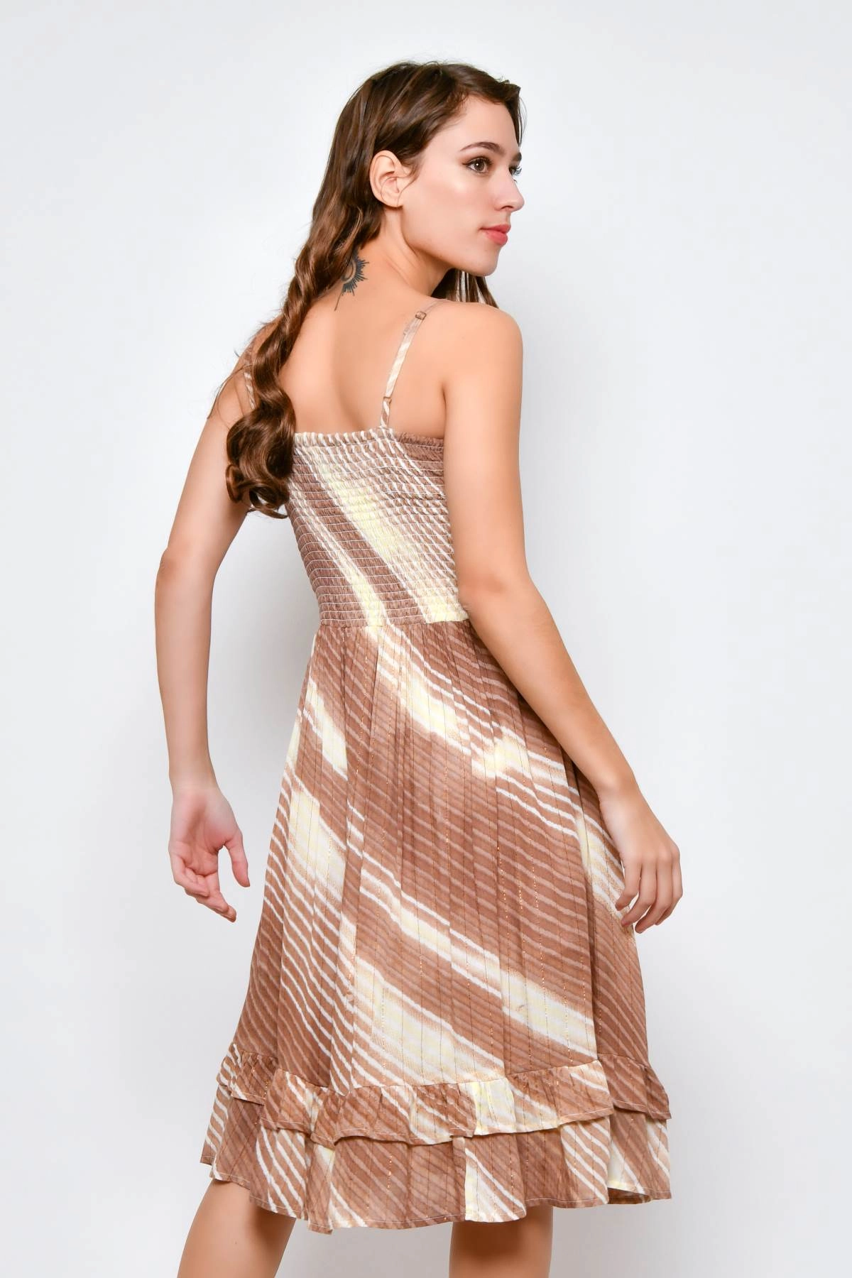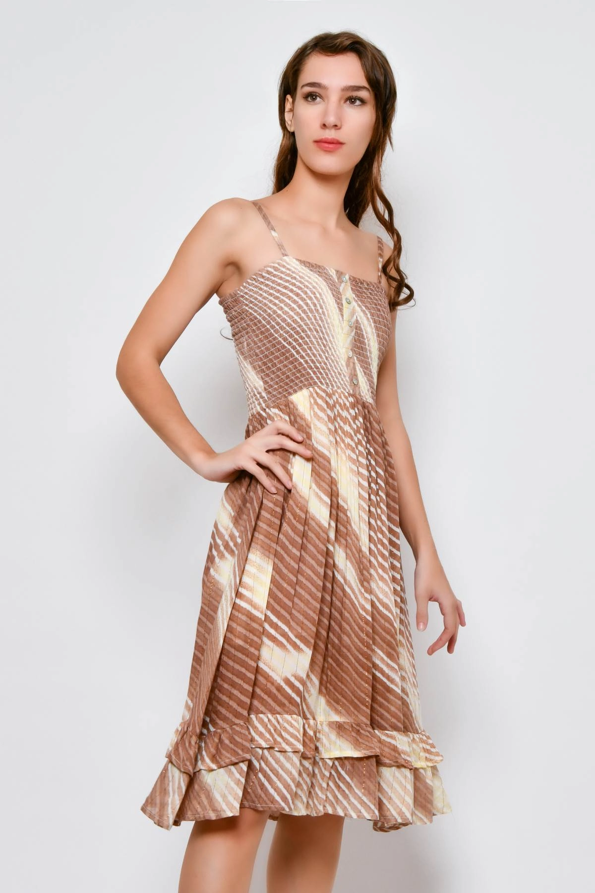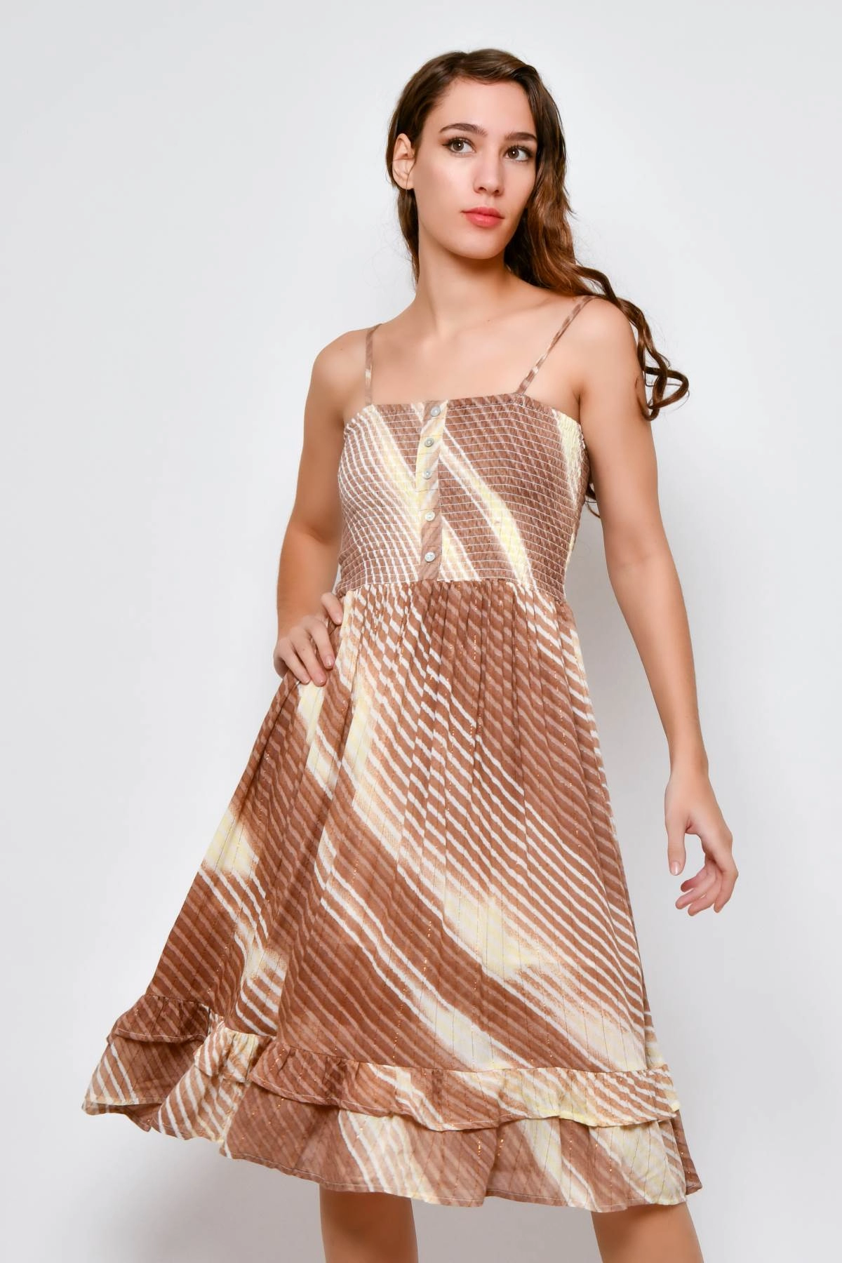 Robe femme d’été avec fines bretelles réglables et buste élastiqué agrémenté de petits boutons décoratifs sur le devant. La coupe évasée est complétée par un volant au bas de la robe. L’imprimé à rayures dans des tons marron, rehaussé de fils lurex dorés, apporte luminosité et personnalité. Réalisée en viscose légère, elle est fraîche sur la peau et adaptée à un usage quotidien par temps chaud.