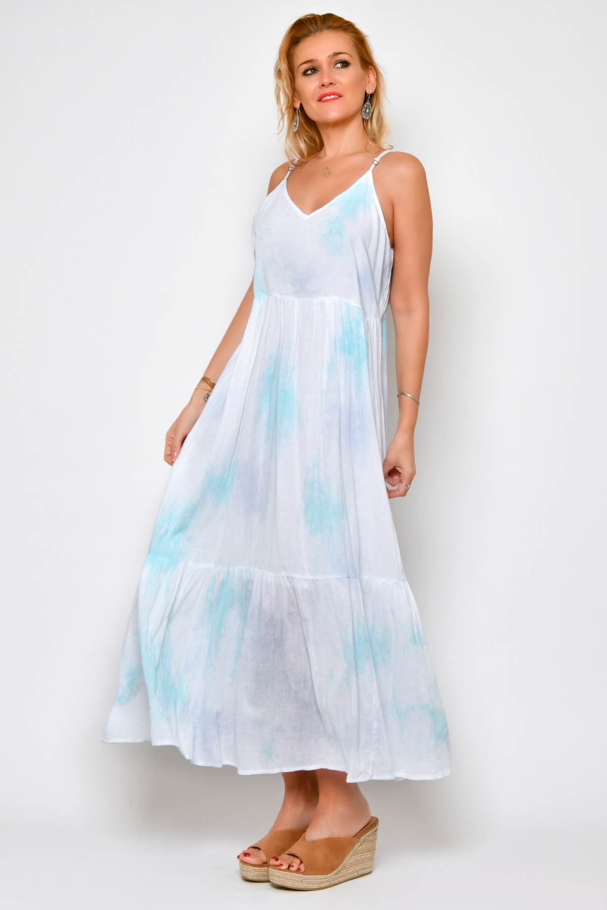 Robe longue femme d’été en coton frais 100 %, à la coupe confortable. Le modèle présente de fines bretelles réglables, un col en V et une coupe à la taille qui met en valeur la silhouette sans serrer. La jupe ample avec volant final apporte mouvement et légèreté. Le coloris blanc avec de délicates nuances bleu clair crée un rendu doux, idéal pour la saison estivale.