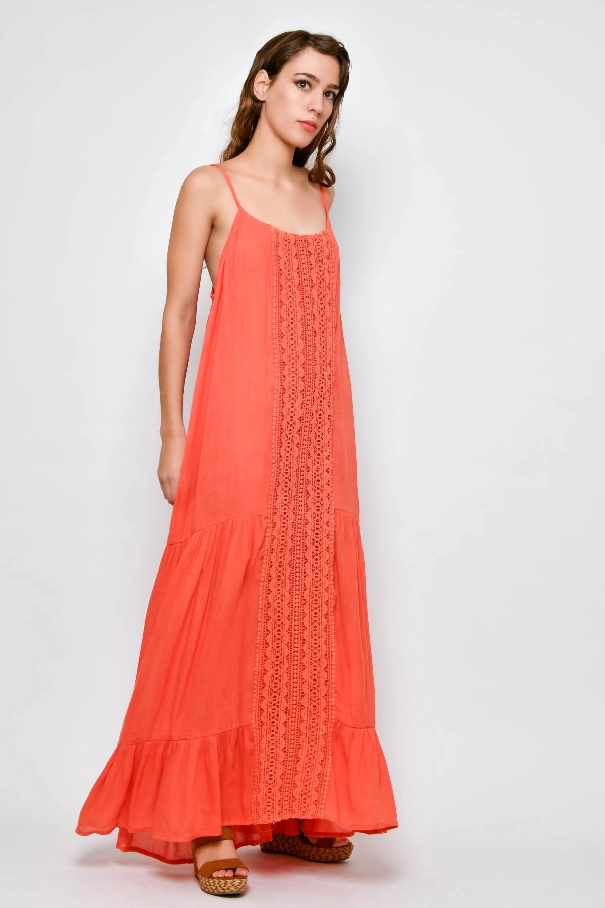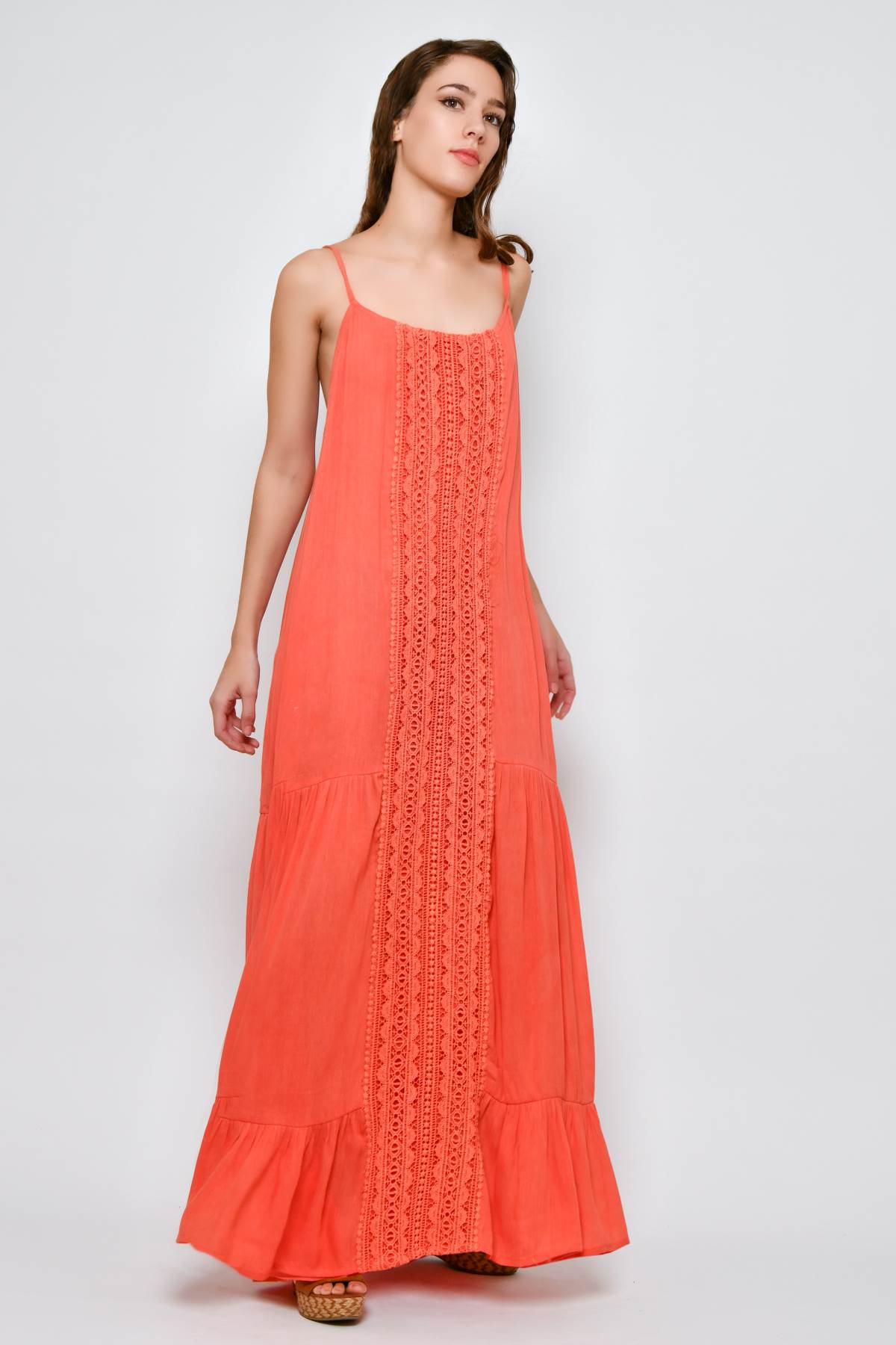 Robe longue femme d’été style Ibiza avec fines bretelles réglables et coupe droite et fluide. Le modèle est sublimé par un empiècement central en dentelle crochet à motifs géométriques en bandes verticales, qui met en valeur la robe, tandis que le volant au bas apporte du mouvement. Réalisée en viscose légère, elle est confortable à porter toute la journée. Idéale pour les vacances, les promenades estivales et le temps libre.