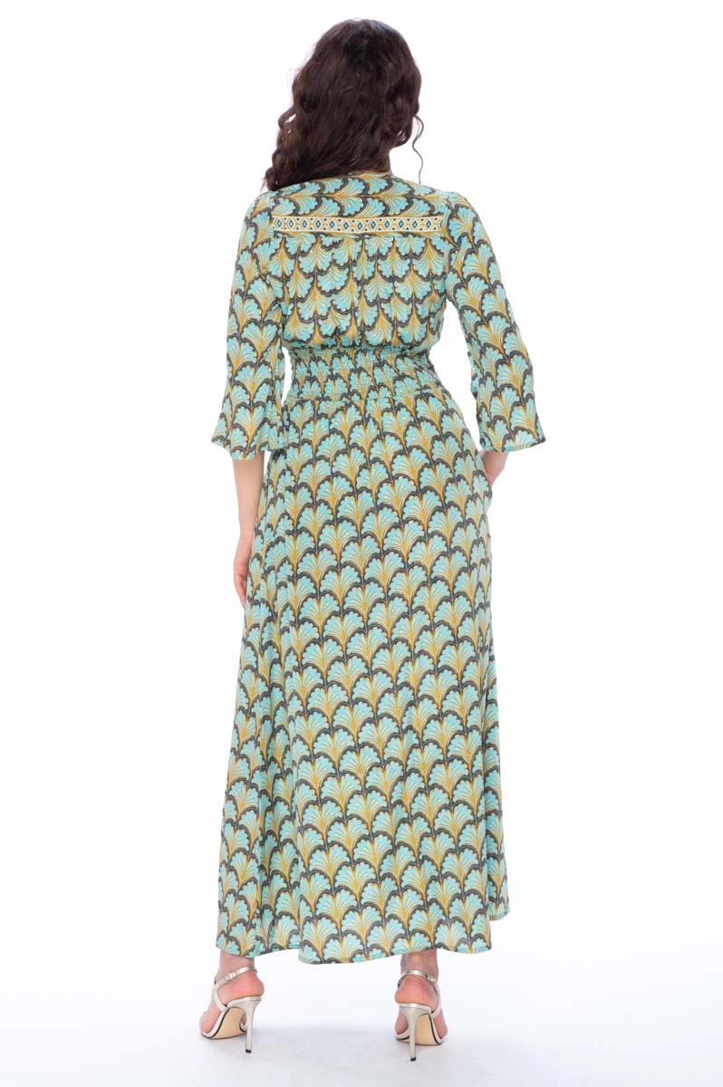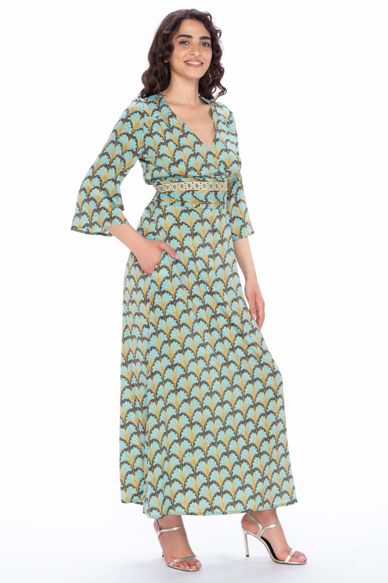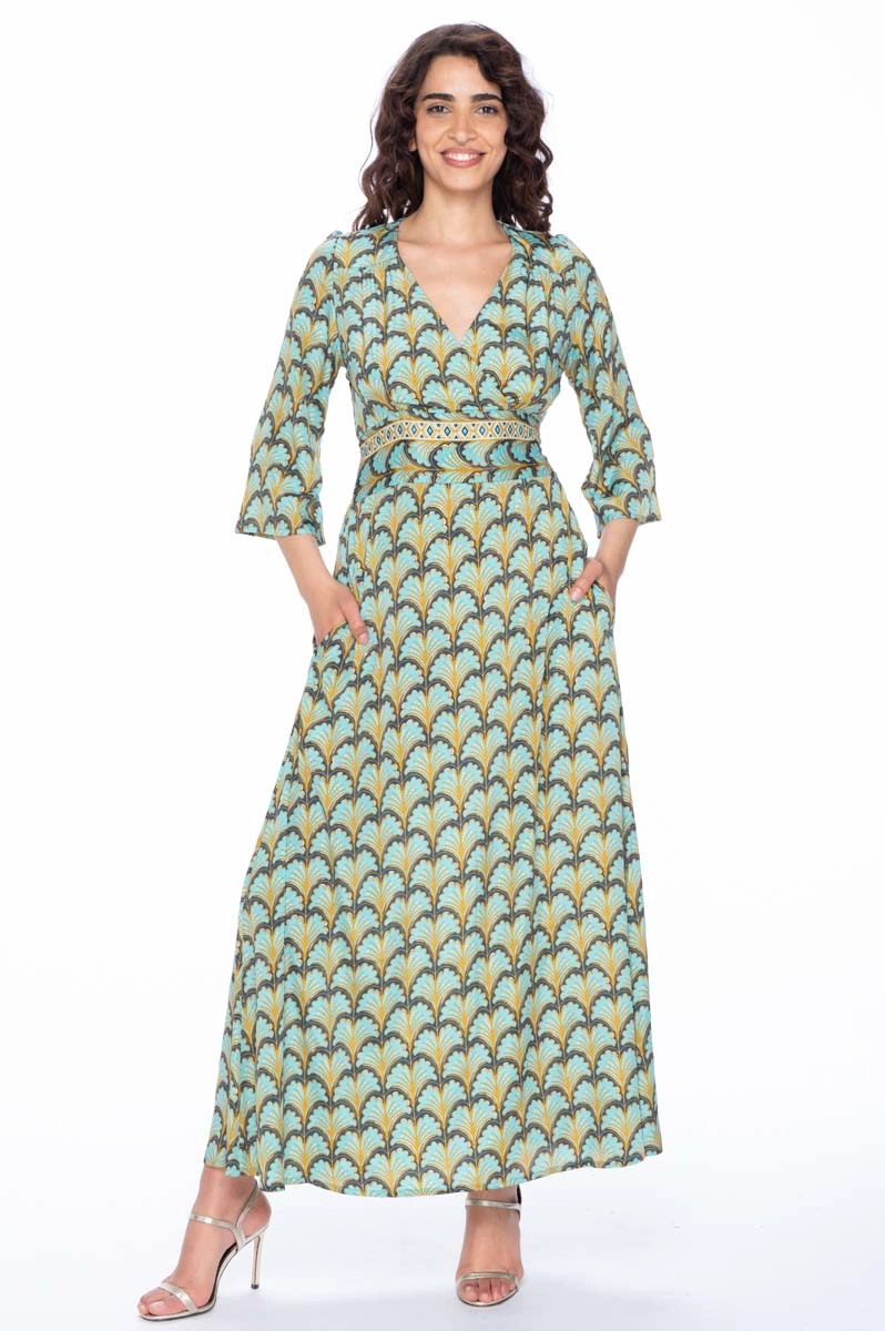 Robe longue en soie indienne avec décolleté en V croisé, manches trois quarts légèrement évasées et poches latérales. La bande décorative sous la poitrine, élastiquée au dos, souligne la taille et met en valeur la silhouette. Cette robe longue femme associe élégance et praticité, idéale pour la saison printemps été. L’imprimé, enrichi d’inserts dorés, apporte de la luminosité au tissu et rend cette robe adaptée aux événements et occasions plus importantes.