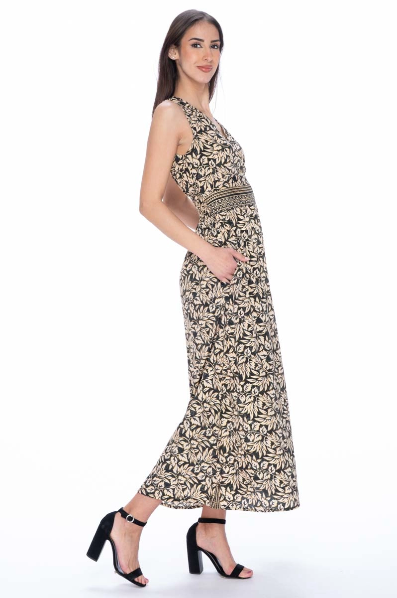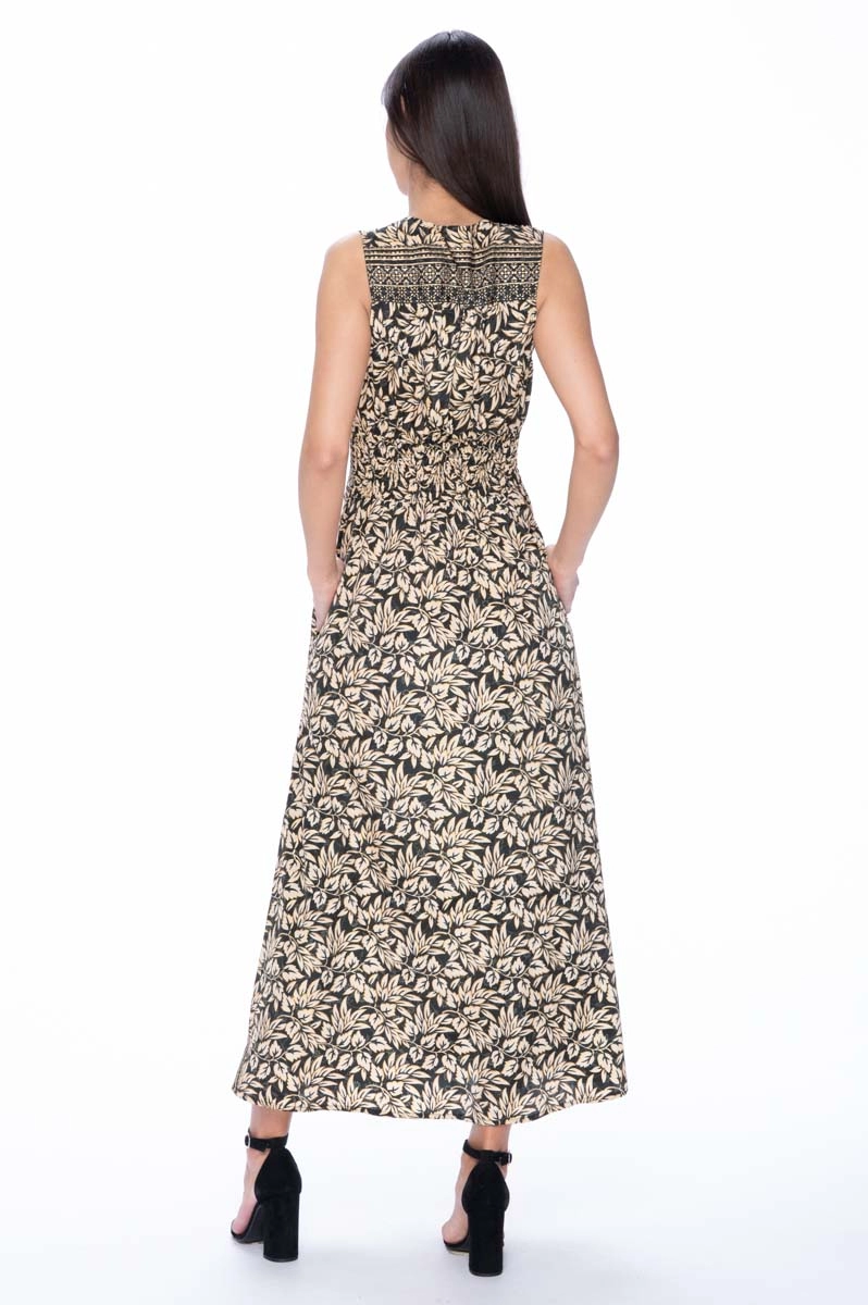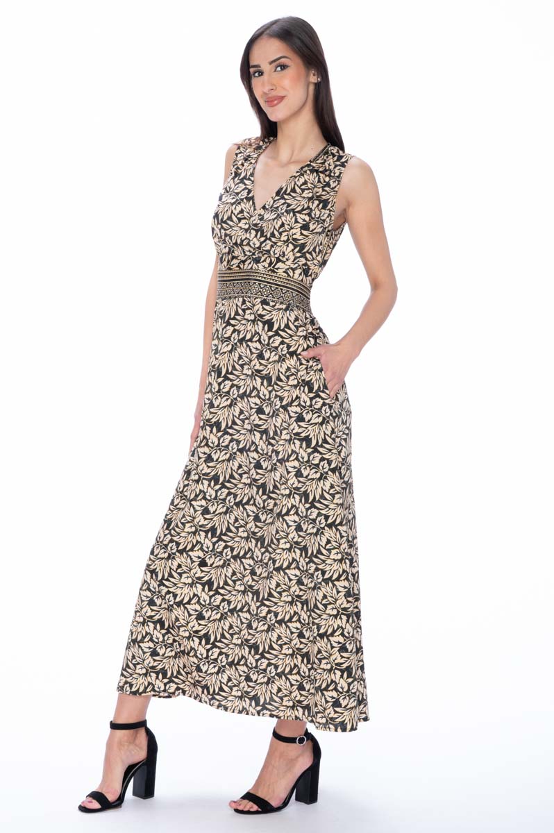 Robe longue sans manches en soie indienne avec poches latérales et décolleté en V croisé qui met en valeur le haut du buste. La taille, élastiquée au dos, est soulignée par une bande décorative qui allonge la silhouette. Le tissu léger et la ligne fluide rendent cette robe longue femme idéale pour la saison estivale.