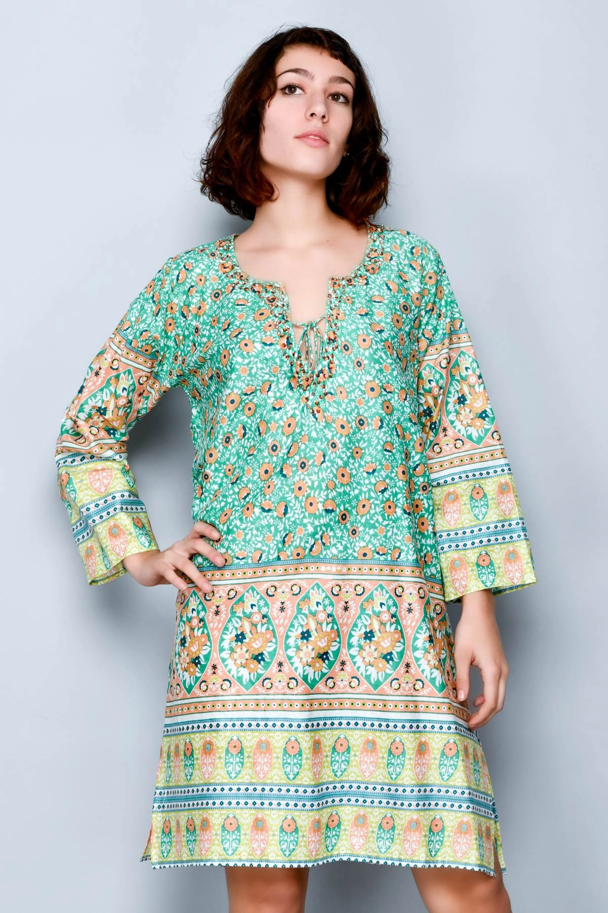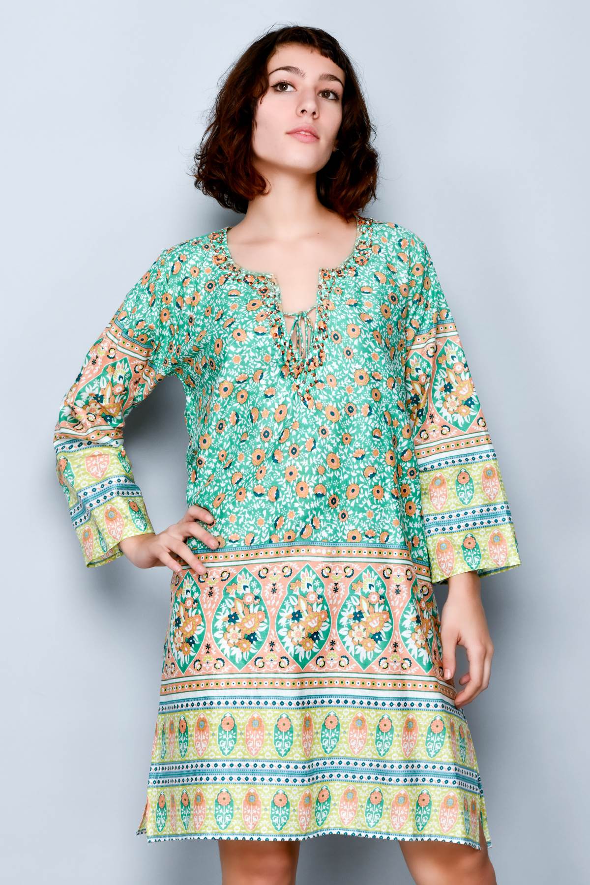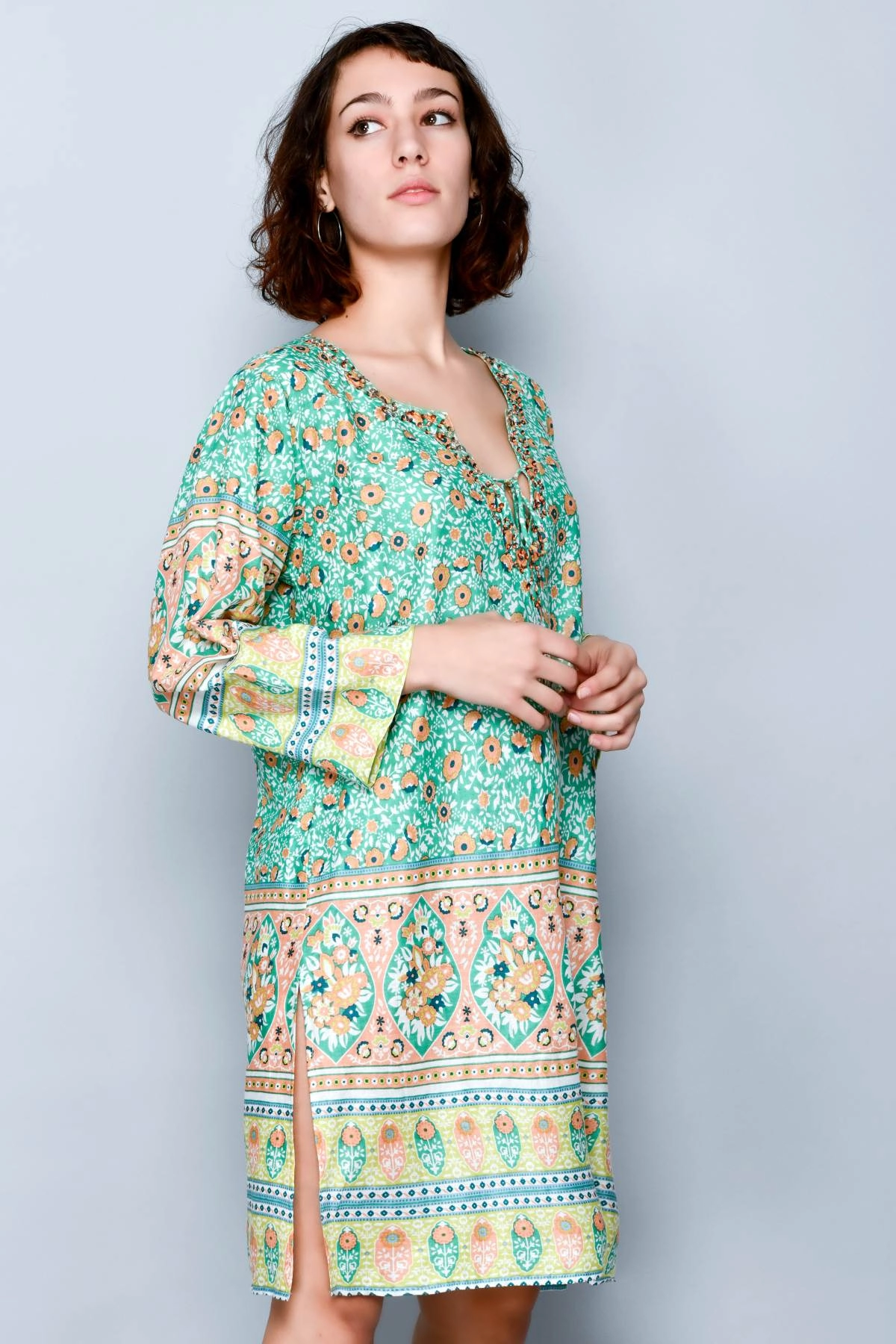 Robe de plage femme légère et fraîche, pensée pour être portée également par-dessus le maillot pendant les journées estivales. Le style évoque l’ambiance Ibiza, avec une coupe confortable et un imprimé idéal pour la plage, la piscine ou les promenades en bord de mer. Facile à enfiler et agréable sur la peau, elle est parfaite par forte chaleur lorsque l’on recherche un vêtement léger mais soigné. La coupe souple convient à différentes morphologies sans serrer ni marquer la silhouette.