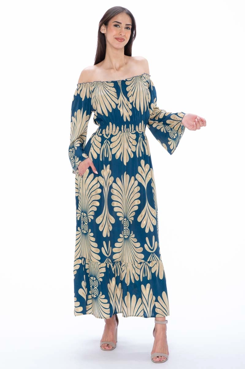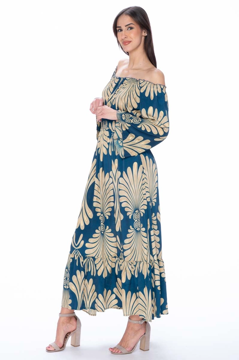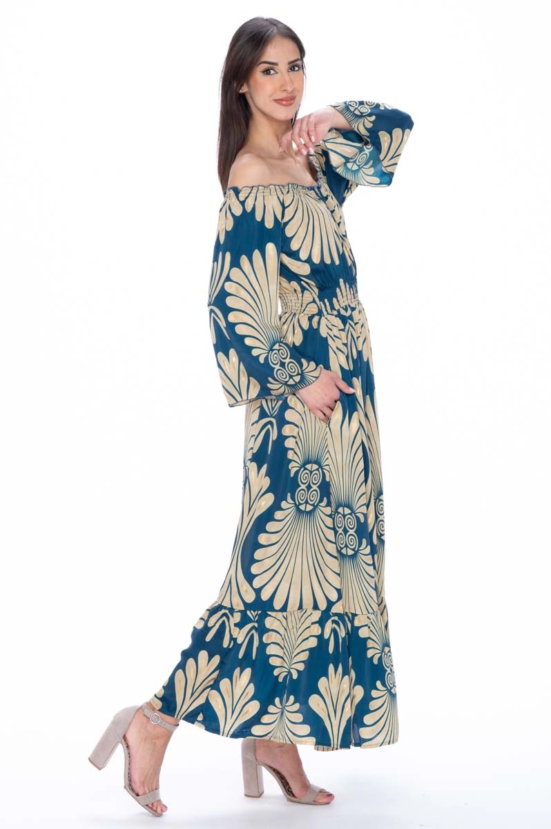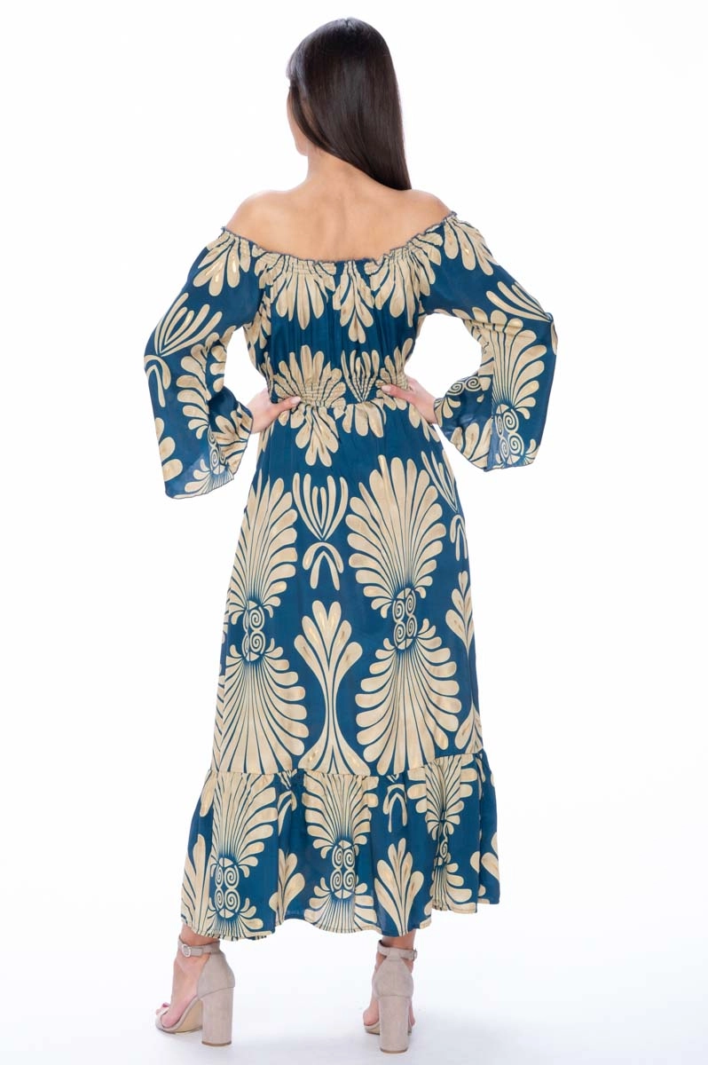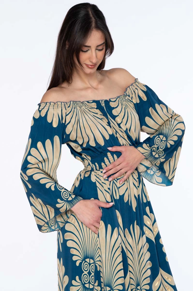 Robe d’été en soie indienne avec encolure Bardot élastiquée laissant les épaules découvertes et mettant en valeur le haut du buste. L’encolure Bardot est une coupe large qui descend sous les épaules, soulignant le cou et les clavicules et créant une ligne douce et féminine. Le volant final et les manches amples complètent le modèle et assurent un confort optimal même pendant les mois les plus chauds. L’imprimé associe des tons bleu et crème avec de délicats inserts dorés.