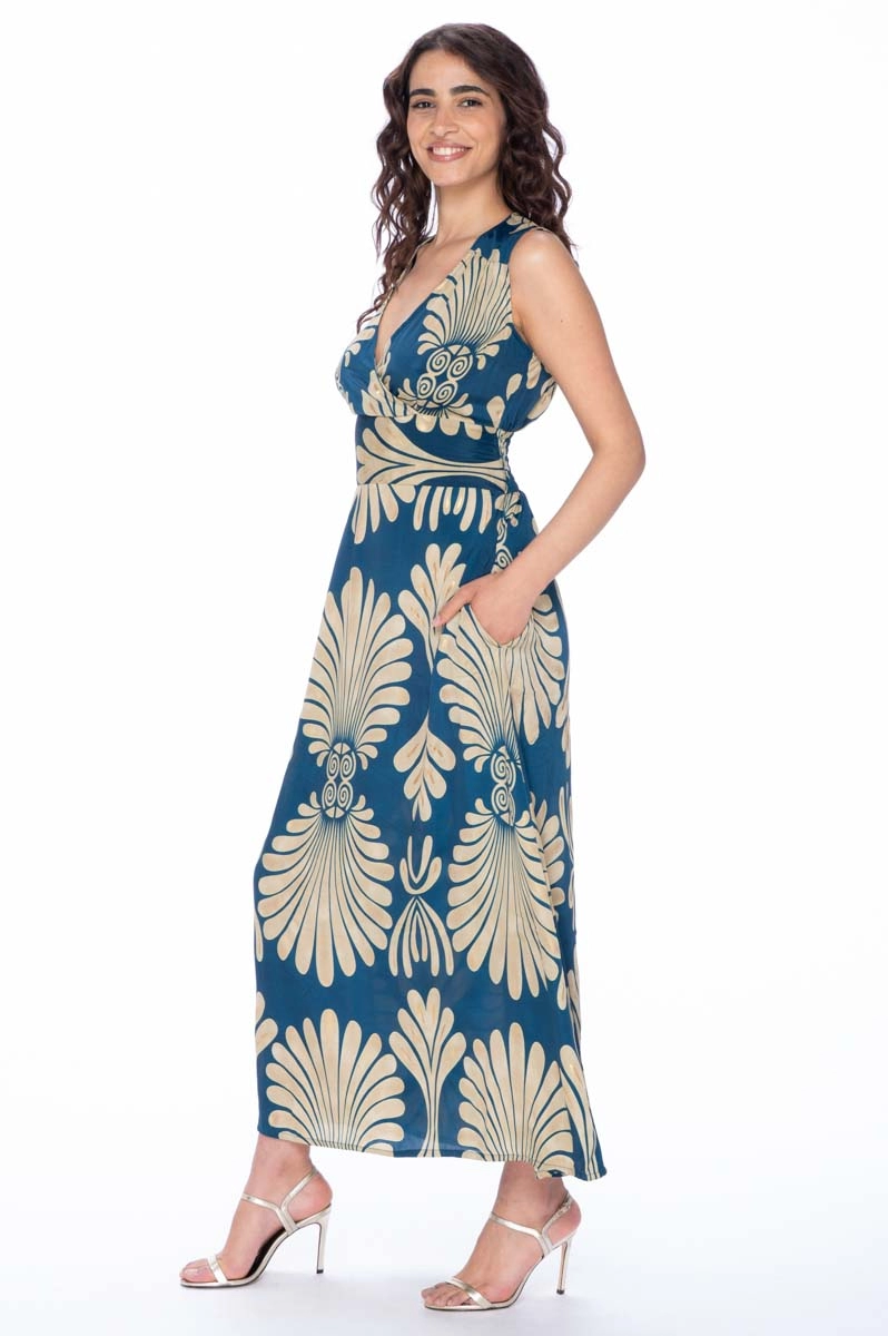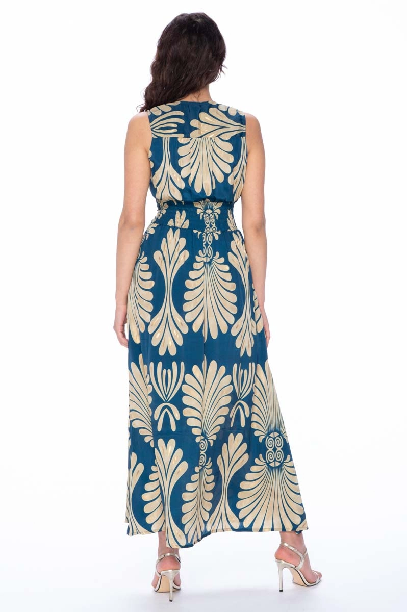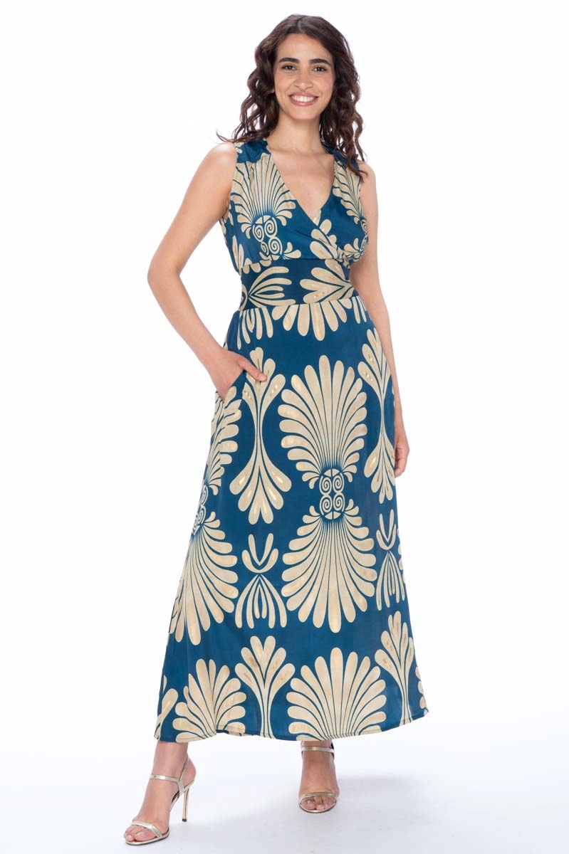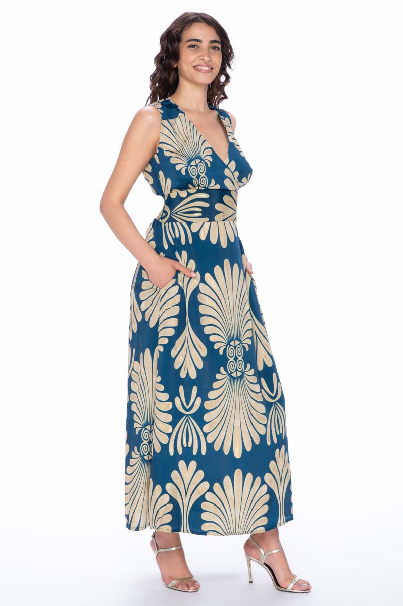 Robe longue sans manches en soie indienne avec poches latérales et décolleté en V croisé qui met en valeur le haut du buste. La taille est soulignée par une bande décorative, élastiquée au dos, permettant à la robe de s’adapter confortablement à la silhouette. Le tissu léger, l’imprimé raffiné avec détails dorés et la ligne fluide rendent cette robe longue femme idéale pour la saison estivale.