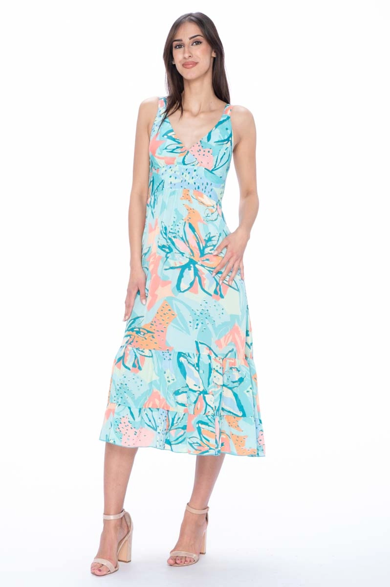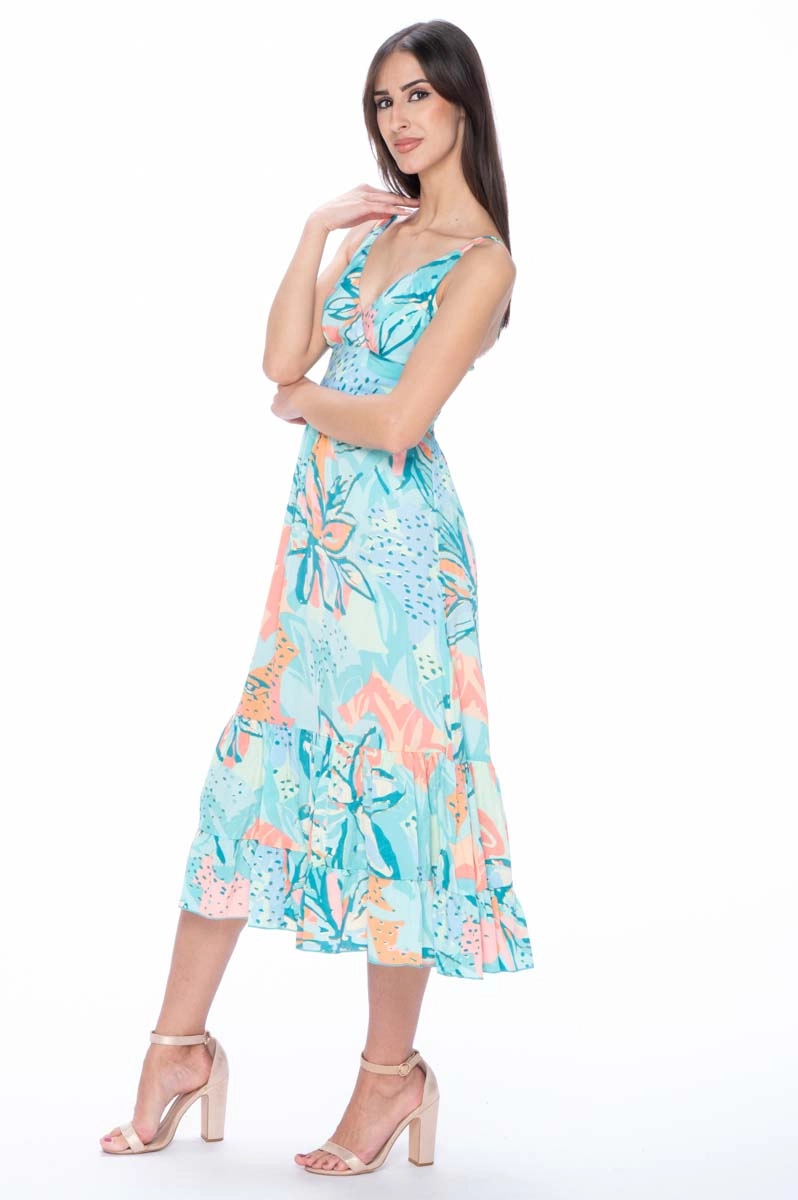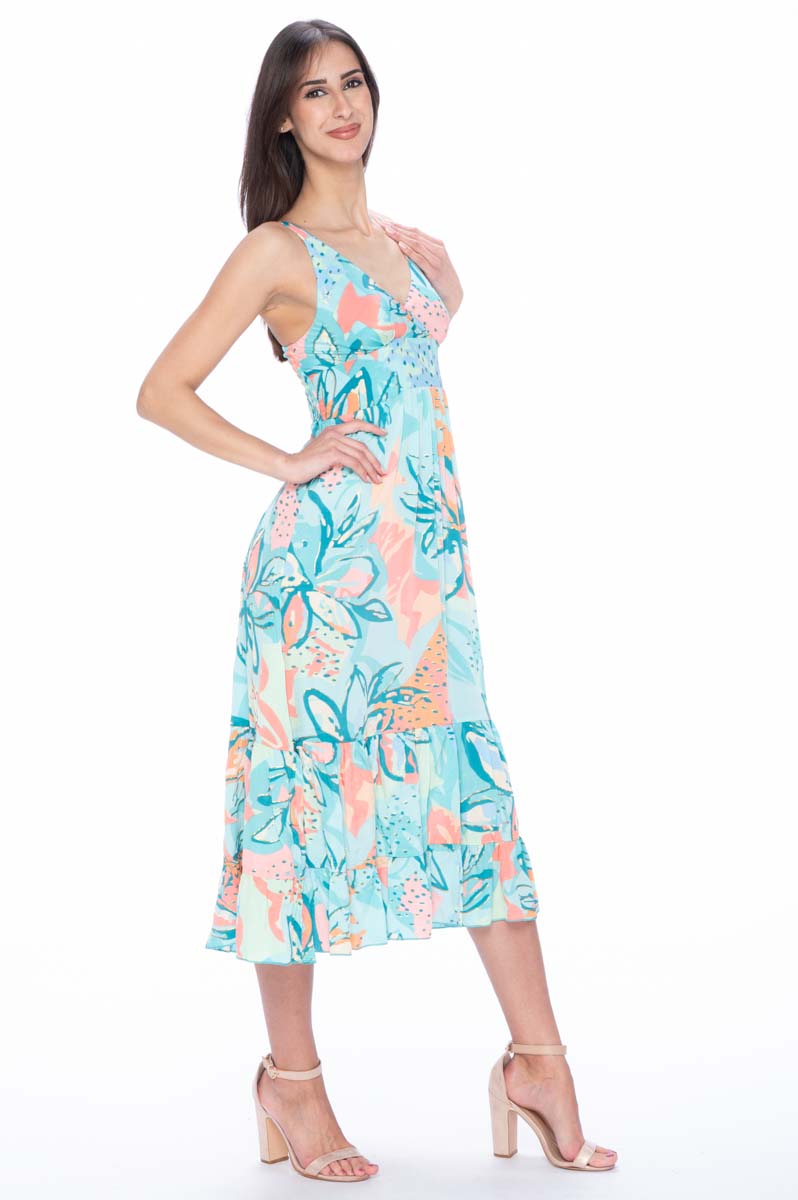 Robe midi en soie indienne avec motif dans les tons bleu clair et rose, enrichi de petits détails dorés. Le modèle présente des bretelles, un décolleté en V croisé et un dos élastiqué qui mettent en valeur la silhouette tout en assurant un confort optimal. La coupe est souple et fluide, complétée par un volant au bas de la robe qui apporte du mouvement.