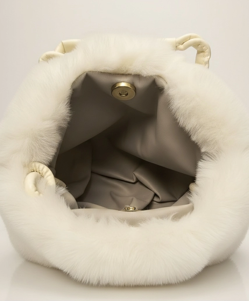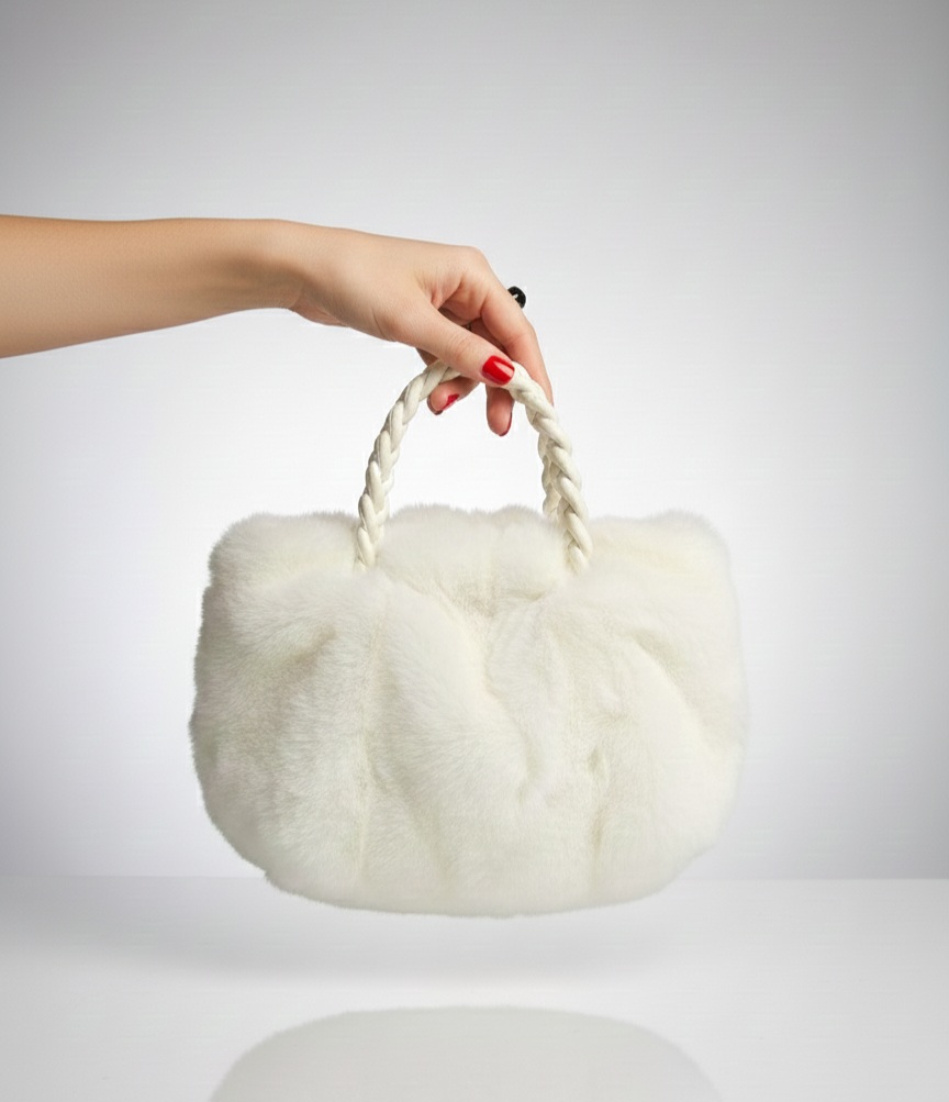 Sac en fausse fourrure blanche de petite taille, doux et agréable au toucher, parfait à porter à la main ou à l’épaule. Les anses tressées en cuir synthétique sont confortables et résistantes, tandis que la bandoulière incluse permet un port pratique lors des déplacements. La fermeture magnétique est fonctionnelle et l’intérieur est entièrement doublé en cuir synthétique, facile à nettoyer et bien fini.